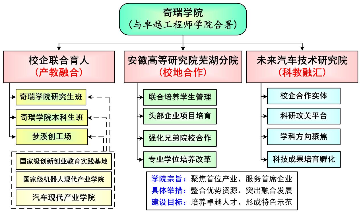 利用安徽高等研究院芜湖分院落户学校国际工程师学院校区的契机,与兄弟院校、头部企业和地方政府深化合作,在校地合作方面形成特色与优势。基于学校与奇瑞公司联合共建的未来汽车技术研究院,汇聚学校优势力量和优势资源,围绕汽车领域培育有竞争力科研团队、形成稳定学科方向,实体化运行,形成服务奇瑞创新发展的科教融汇育人基地。